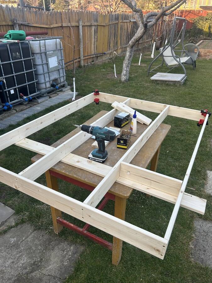Slniečko ma vyháňa na záhradu, no zistil som že aj vonku sa dajú robiť užitočné veci a tak začala stavba rámu 🙂