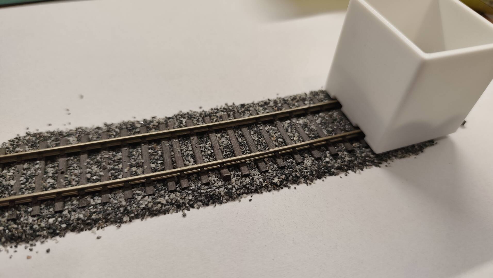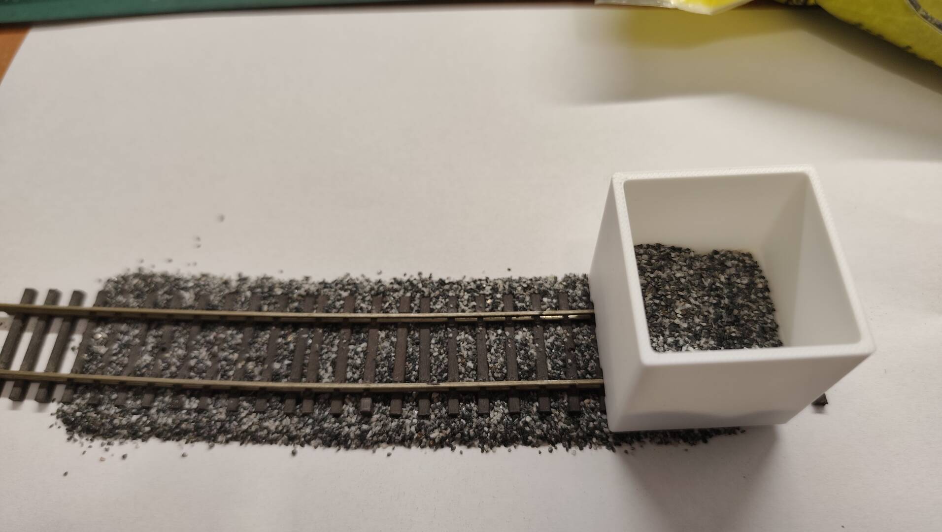 Najnovšia novinka zatiaľ iba pre H0 modelárov, ale mala by byť neskôr aj pre TT, dávkovač štrku na zaštrkovanie koľajiva.